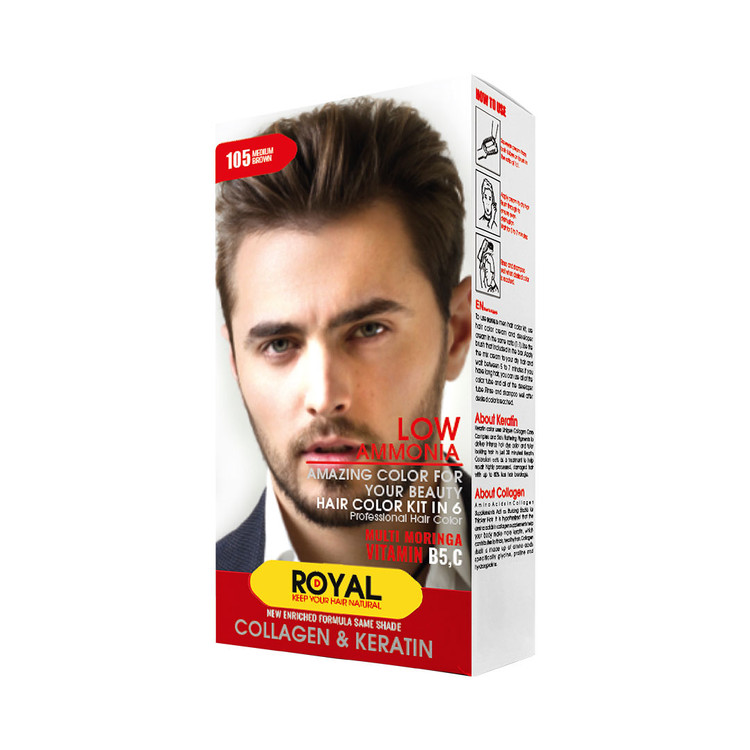 شماره پروانه : 56/14822 کیت رنگ موی مردانه رویال با بکارگیری از پیشرفته ترین فرمولاسیون روز دنیا و روش مصرفی هوشمندانه در طراحی این کیت، علاوه بر استفاده بسیار آسان، بهترین عملکرد و رنگ پذیری را برای موهای شما به ارمغان میآورد. کیت های رنگ موی مردانه رویال در 5 رنگ، در طیف های قهوهای و مشکی مناسب برای انواع سلیقههای تولید و عرضه شده است. در کیت رنگ موی مردانه دو تیوپ 50 میلی لیتر وجود دارد که تیوپ سفید، اکسیدان کِرمی و تیوپ خاکستری، رنگ موی آن میباشد.