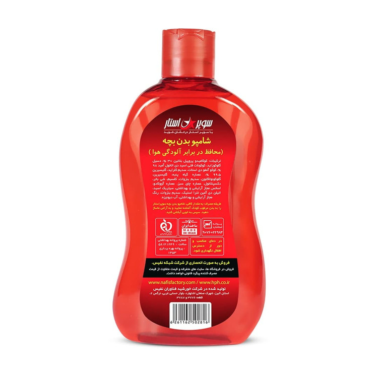 دیدن محصولات مرتبطپروانه بهداشت: ۵۶/۲۱۲۴۹ شامپو بدن کودک شویندهای ملایم با قدرت پاک کنندگی مناسب که باعث نرم و مرطوب شدن پوست میگردد. پوست بدن کودکان قدرت چربيسازي زيادي ندارد به همین دلیل برای آنها نباید از شامپوهای بزرگسالان که قدرت قلیایی بالاتری دارند شود. در این شامپو که مخصوص کودکان ساخته شده PH قليايي نزديک به 7، يعني خنثي است که مناسب جنس پوست آنها است. در پوست کودک غدههای چربی به طور کامل تشکیل نشده است و بنابراین پوست كودك چربی كمتری دارد. ترکیبات شامپو بدن کودک سوپراستار به گونهای است که میتواند پوشش مناسبی روی پوست بدن کودکان که ملانین كمتری میسازد ایجاد کرده و از آن در برابر تابش نور خورشید و آلودگی هوا محافظت کند.